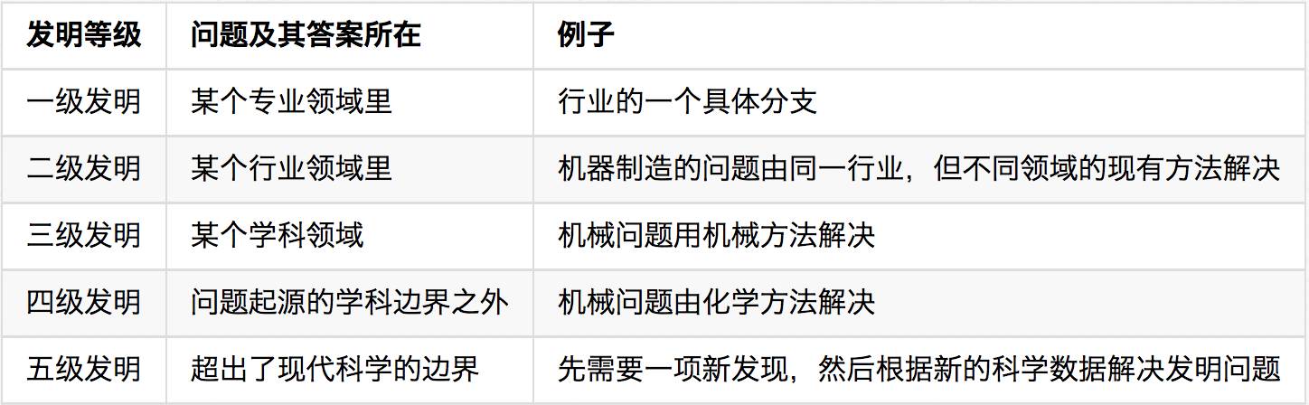 | 发明等级 | 问题及其答案所在 | 例子 | | --- | --- | --- | | 一级发明 | 某个专业领域里 | 行业的一个具体分支 | | 二级发明 | 某个行业领域里 | 机器制造的问题由同一行业,但不同领域的现有方法解决 | | 三级发明 | 某个学科领域 | 机械问题用机械方法解决 | | 四级发明 | 问题起源的学科边界之外 | 机械问题由化学方法解决 | | 五级发明 | 超出了现代科学的边界 | 先需要一项新发现,然后根据新的科学数据解决发明问题 |