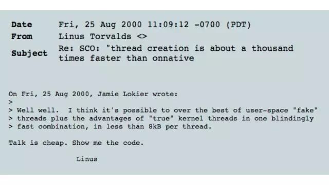 比如: https://lkml.org/lkml/2000/8/25/132 就是 Linux 创始人 Linus 在 13 年前的一场讨论中的邮件原文,里面有一句技术著名宣言: Talk is cheap. Show me the code. 能侃不算什么,有本事把代码拿出来看看。