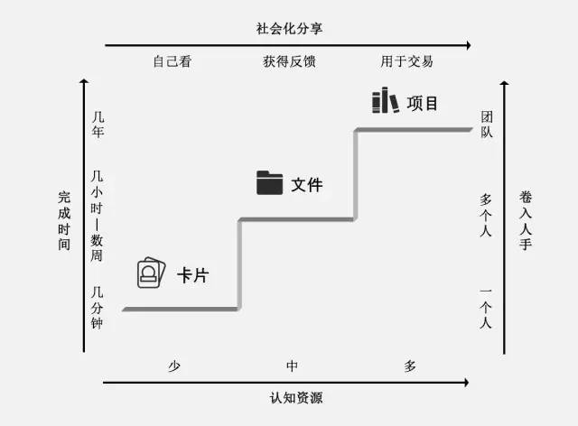 到了文件层级,则需要耗费的心力更多,往往耗费数小时与数周不等,此时输出的作品往往侧重用于与他人交流。再到了项目层级,则往往卷入了更多人,需要耗费的时间更长,从数周到数年不等。项目成果常常用作交易,是自己在社会上立足之本。