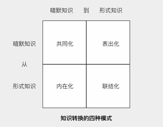 如何构建一套好的知识创造系统呢?按照野中郁次郎的研究,生成新知识,暗默知识与形式知识的相互转换有四种模式:从暗默知识到暗默知识的「共同化」过程;从暗默知识到形式知识的「表出化」过程;从形式知识到暗默知识的「内在化」过程;从形式知识到形式知识的「联结化」过程。如下图所示: